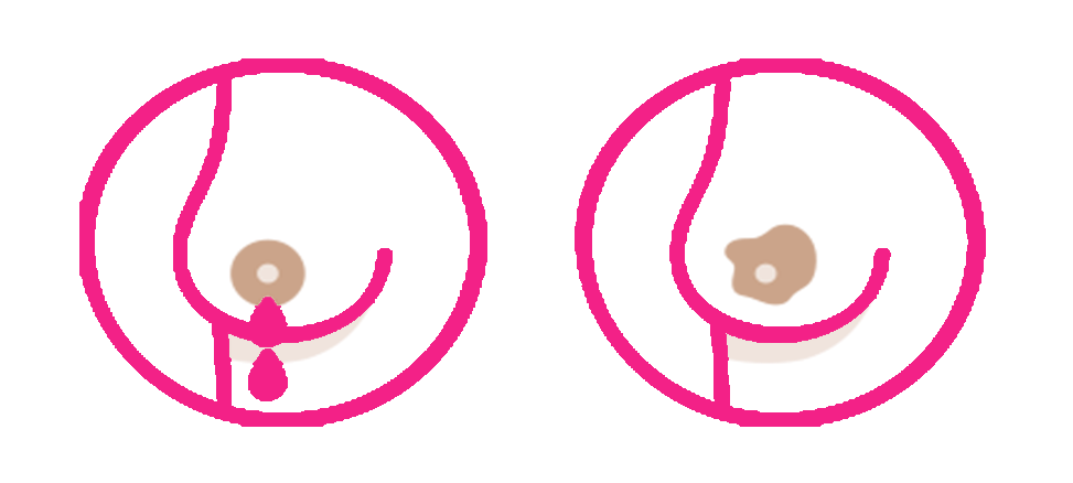 Bulka, jakýkoliv útvar, který předchozí měsíc v prsu hmatný nebyl, vpáčená bradavka nebo kůže na prsu, výtok z bradavky, zčervenání prsu, změna struktury kůže na prsu, krvácení z kůže okolo bradavky, bolest prsu.